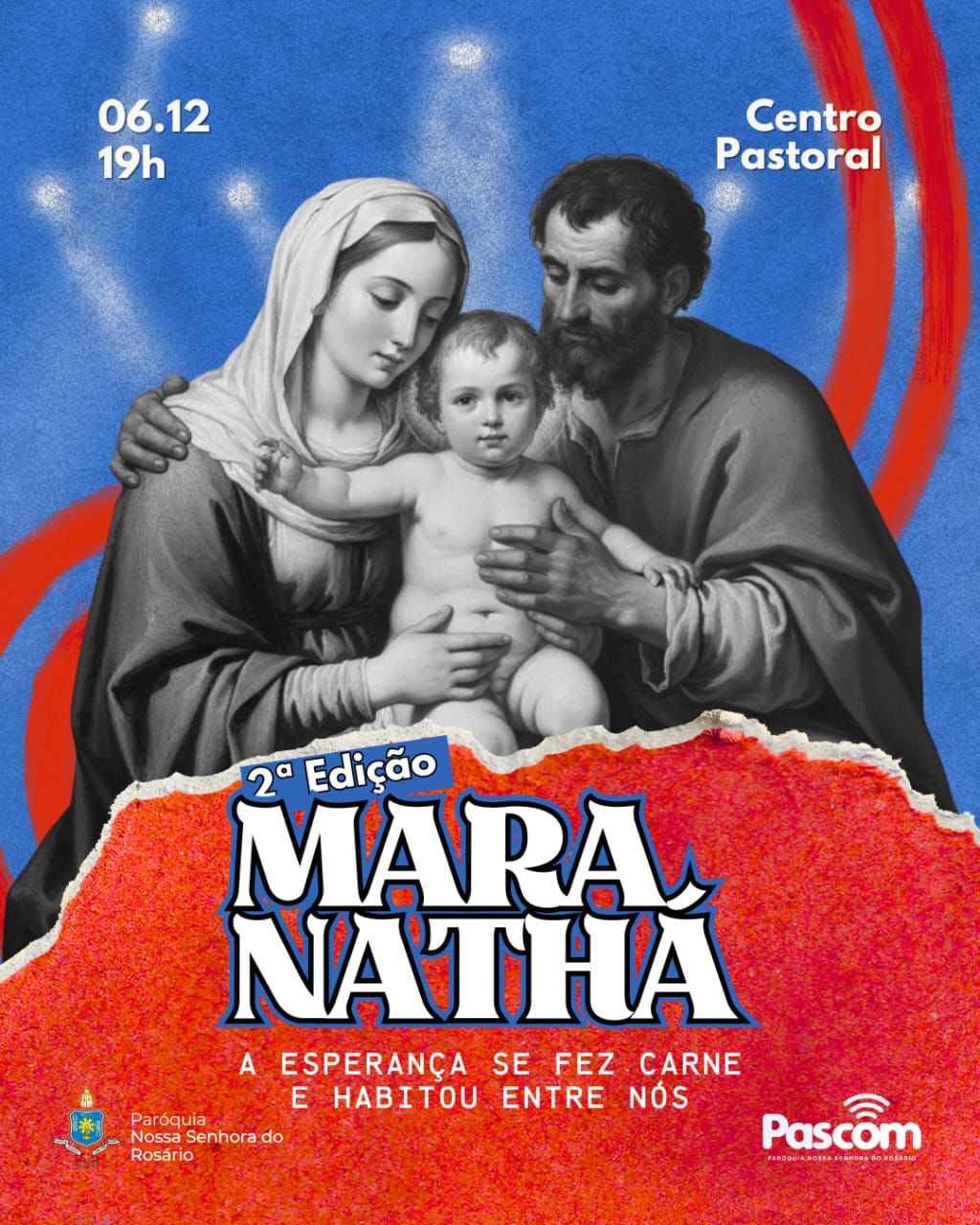 O Maranathá acontecerá no dia 6 de dezembro, às 19h, no Centro de Pastoral da Paróquia Nossa Senhora do Rosário. A programação inclui animação, oração e partilha, criando um ambiente acolhedor para todos que desejam viver algo novo em sua relação com Deus.