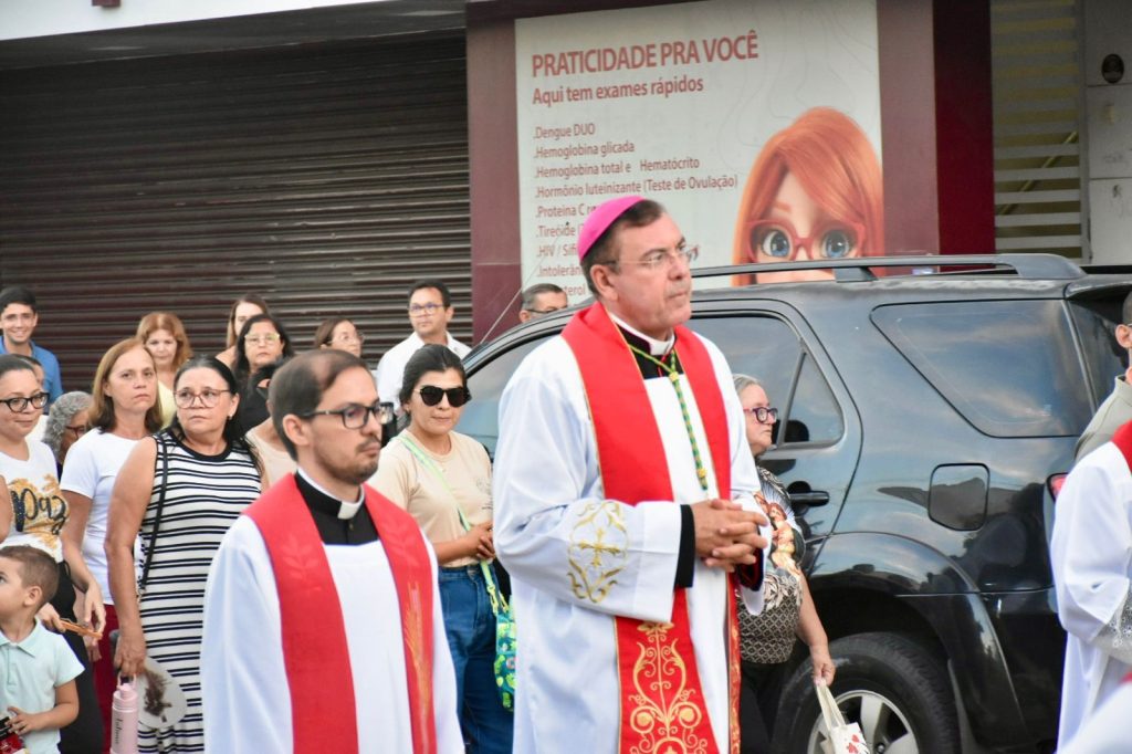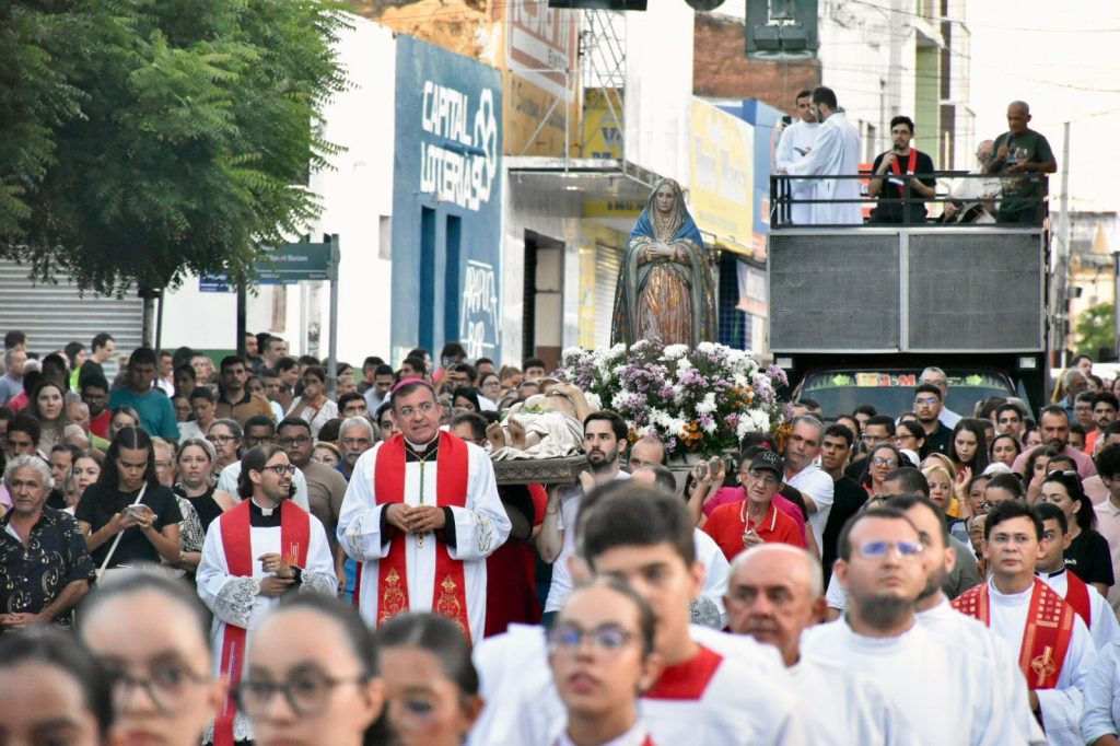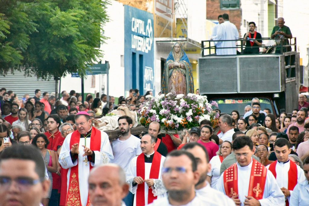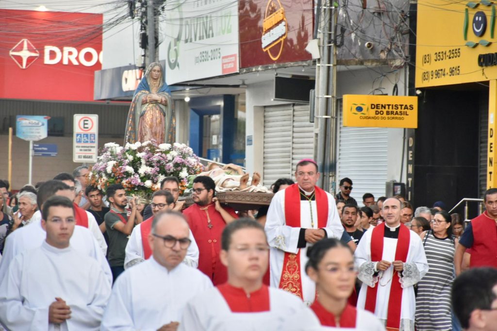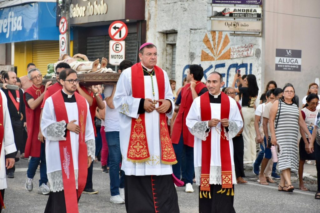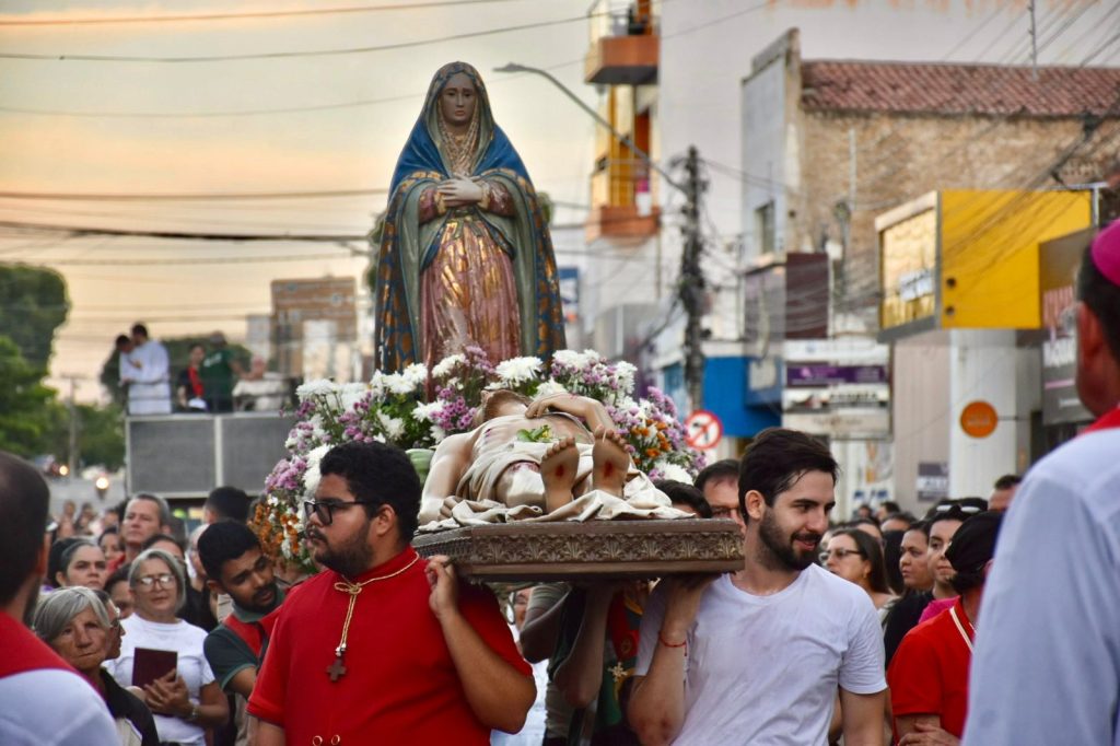 Na última sexta-feira, 3 de abril, às 17h, a Diocese de Cajazeiras viveu um dos momentos mais comoventes da Semana Santa: a tradicional Procissão do Senhor Morto. Reunidos na Catedral Diocesana, fiéis, leigos, religiosas, religiosos, diáconos e sacerdotes, juntamente com o bispo diocesano Dom Francisco de Assis, seguiram em caminhada até a Matriz de Nossa Senhora de Fátima, em um percurso marcado por silêncio, oração e profunda reflexão.